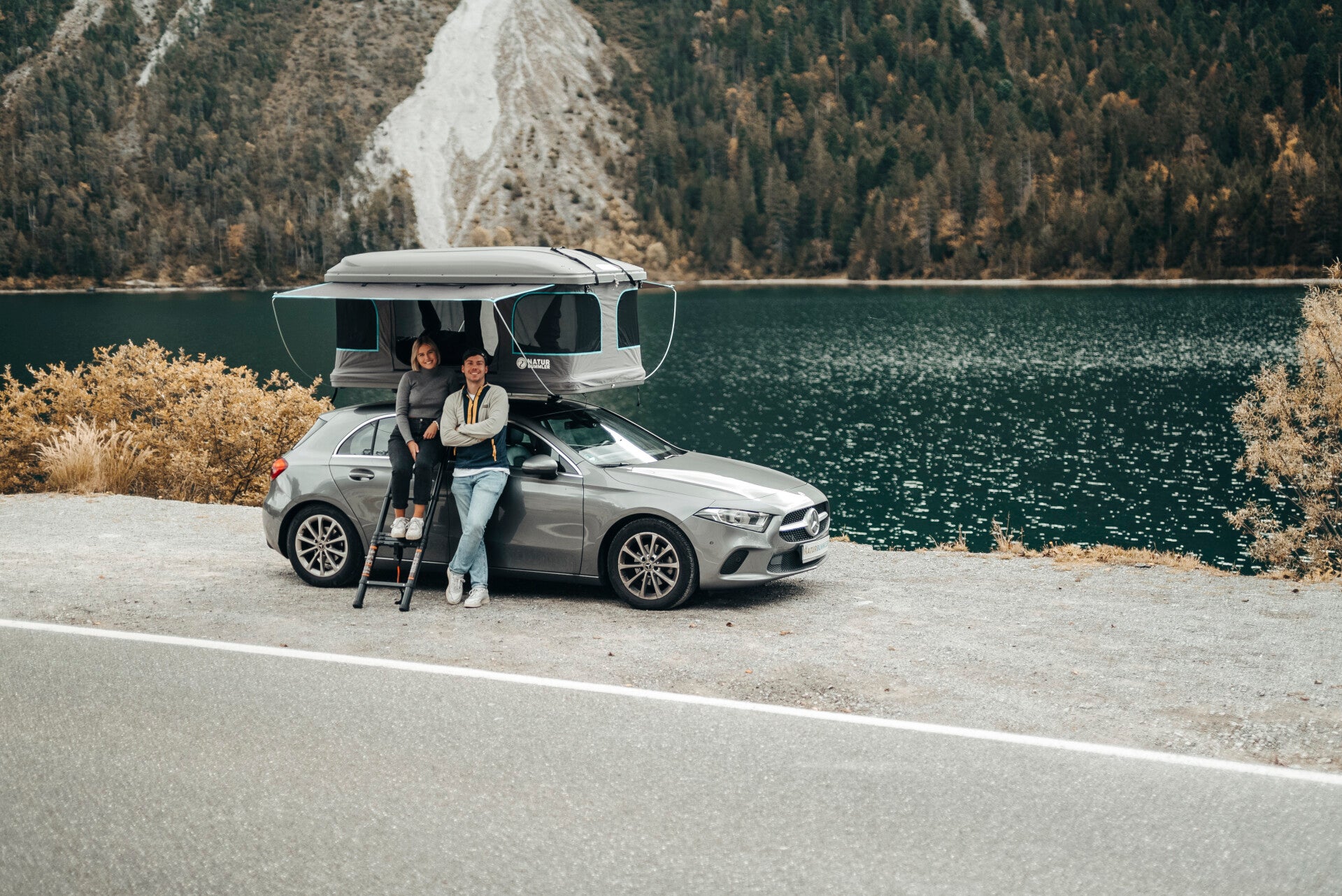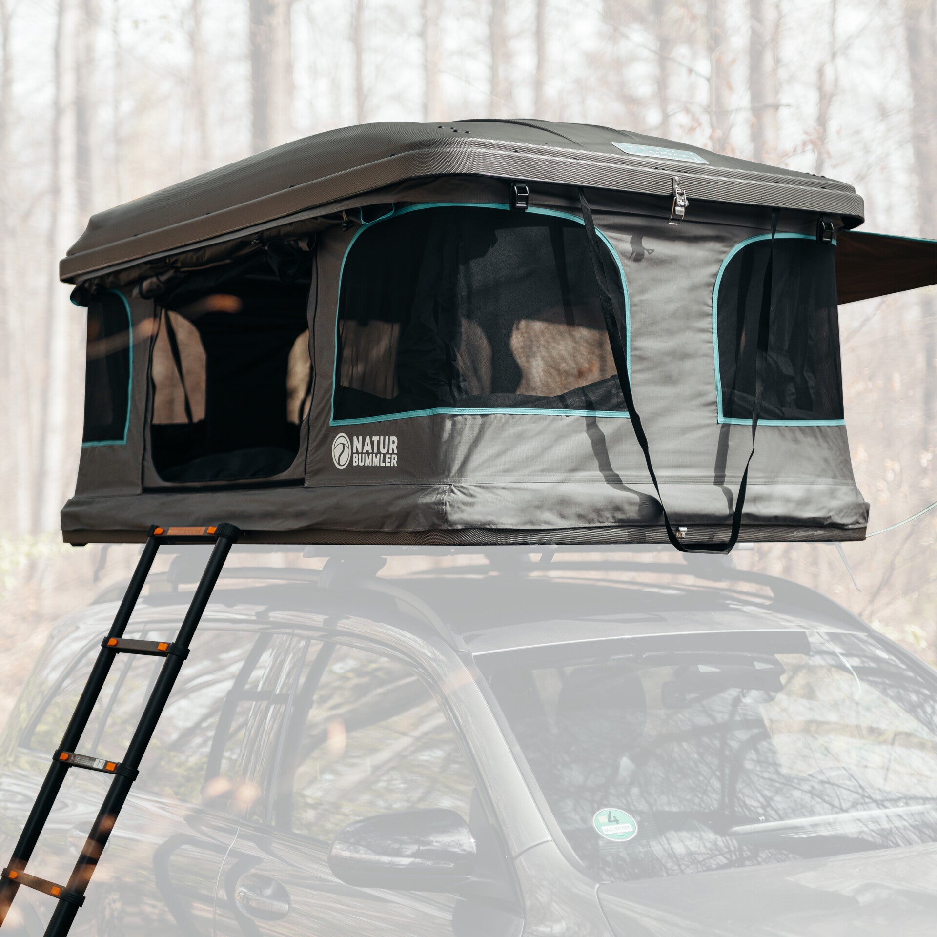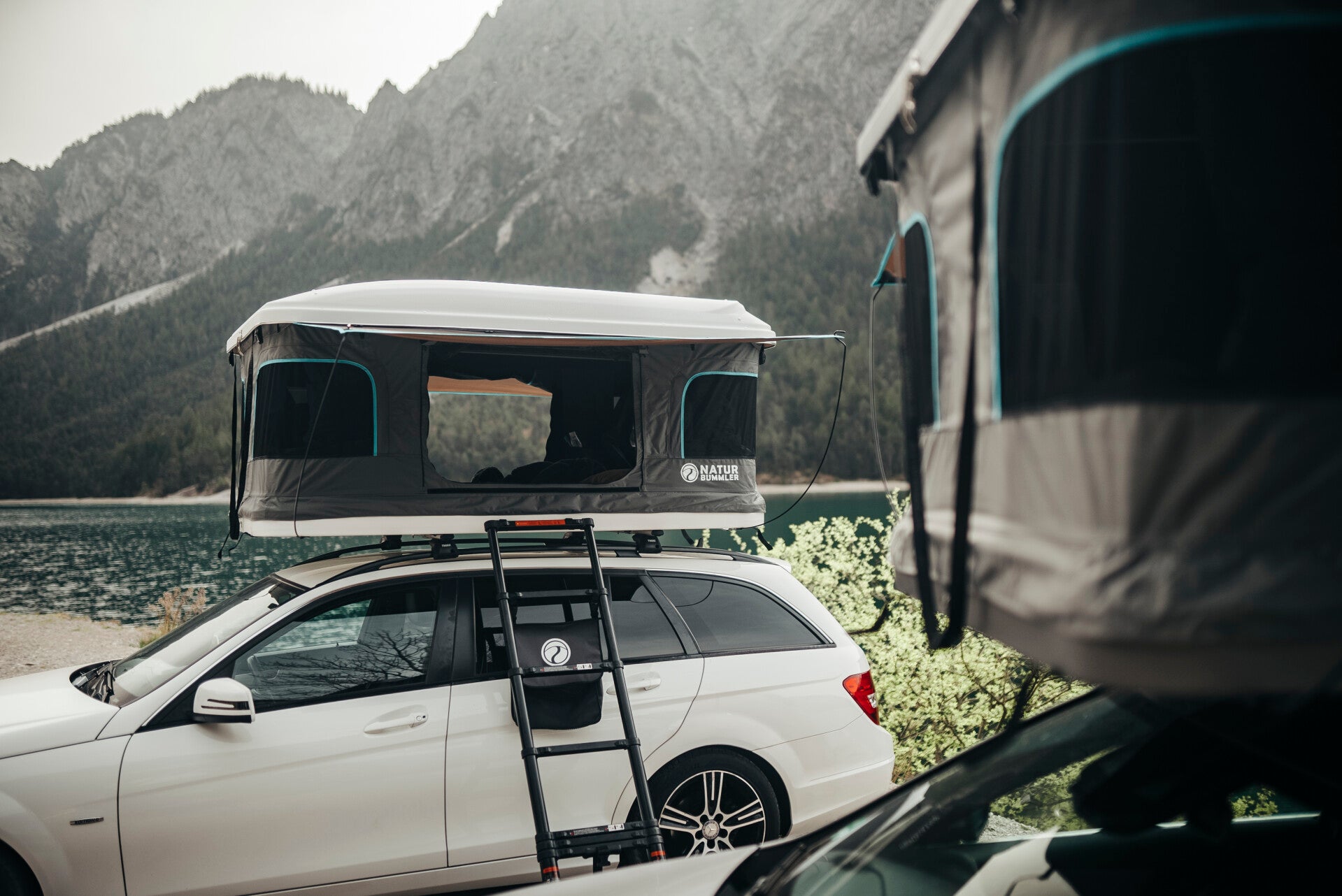 Die Außenschale des Dachzelts besteht aus leichtem aber sehr robustem Polycarbonat. Durch die vier Gasdruckfedern bekommst du das Zelt innerhalb einer Minute vollständig aufgebaut. Die stabile Teleskopleiter aus Aluminium ist auch im Lieferumfang enthalten. Diese lässt sich einfach an jeder Tür einhaken und kann neben der Bettwäsche auch im geschlossenen Dachzelt transportiert werden. Es muss also nie etwas umgeräumt werden.