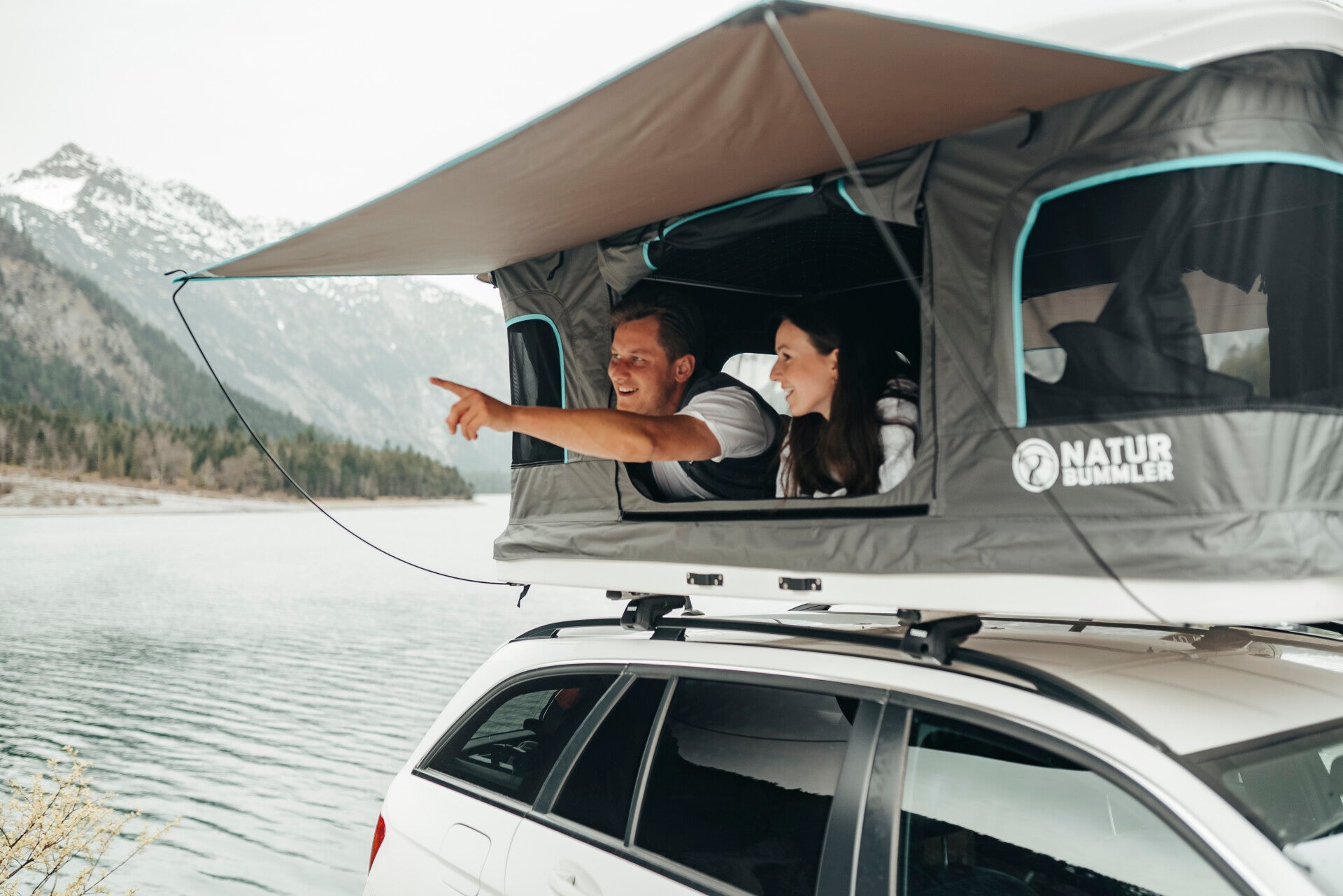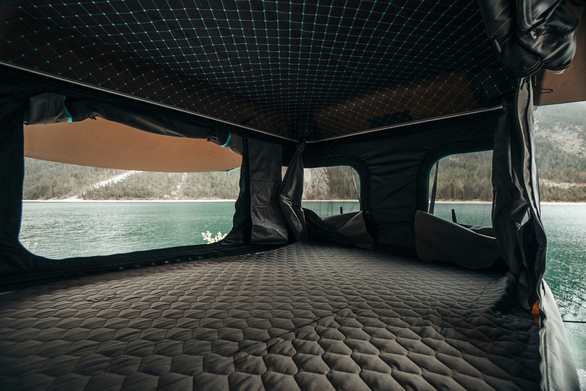 Im Innenraum des Hartschalen-Dachzelts erwartet dich an der Decke und unter der Matratze eine Flanell-Verkleidung zur besseren Isolierung. Damit kühlt das Zelt langsamer aus und wärmt sich aber auch gleichzeitig langsamer auf. Die vier Fenster sorgen bei Bedarf für ausreichend Frischluft im Dachzelt. Damit steht einem wunderbaren Panoramaausblick nichts im Weg.